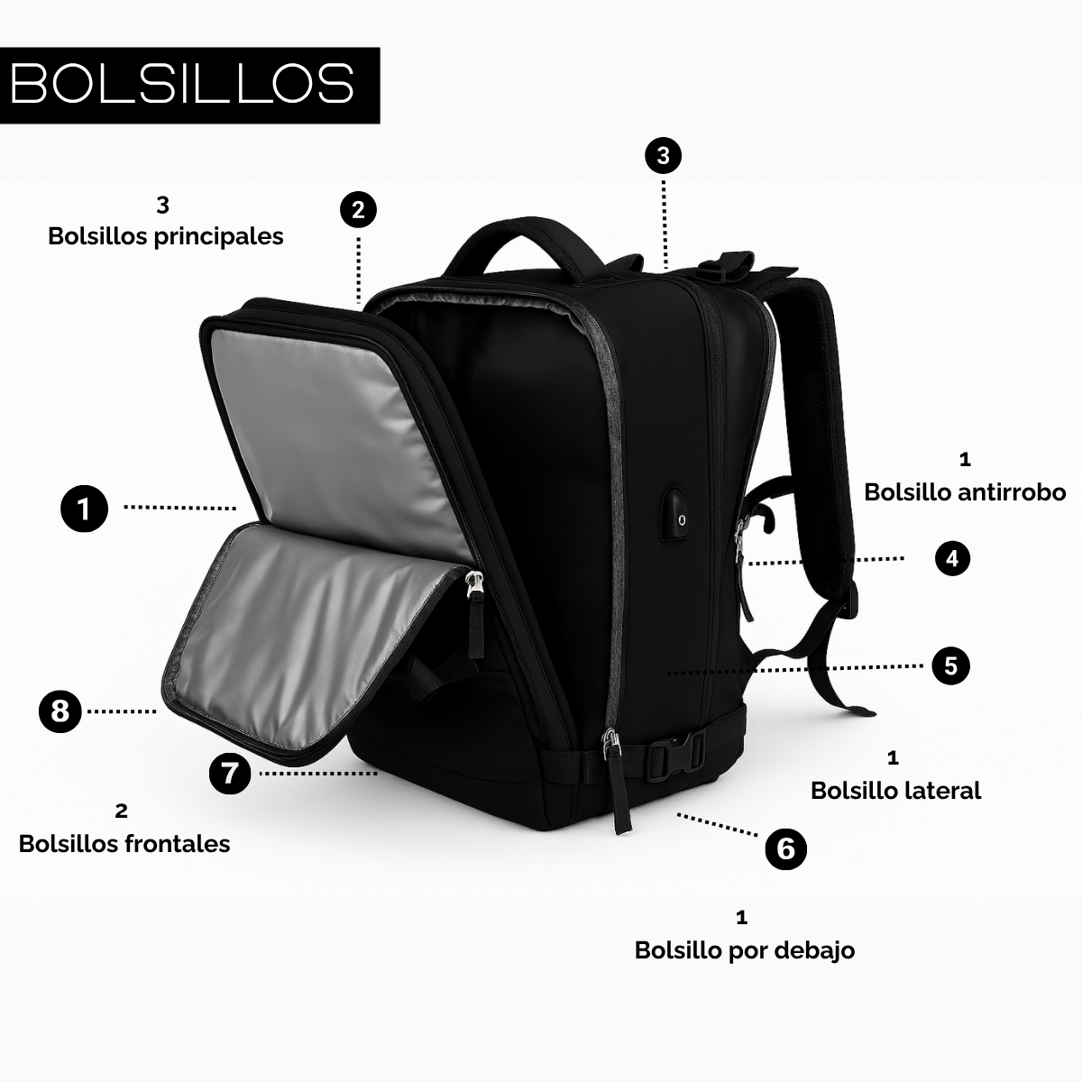 -Cuenta con 7 compartimentos organizadores, incluyendo bolsillo lateral para botellas.