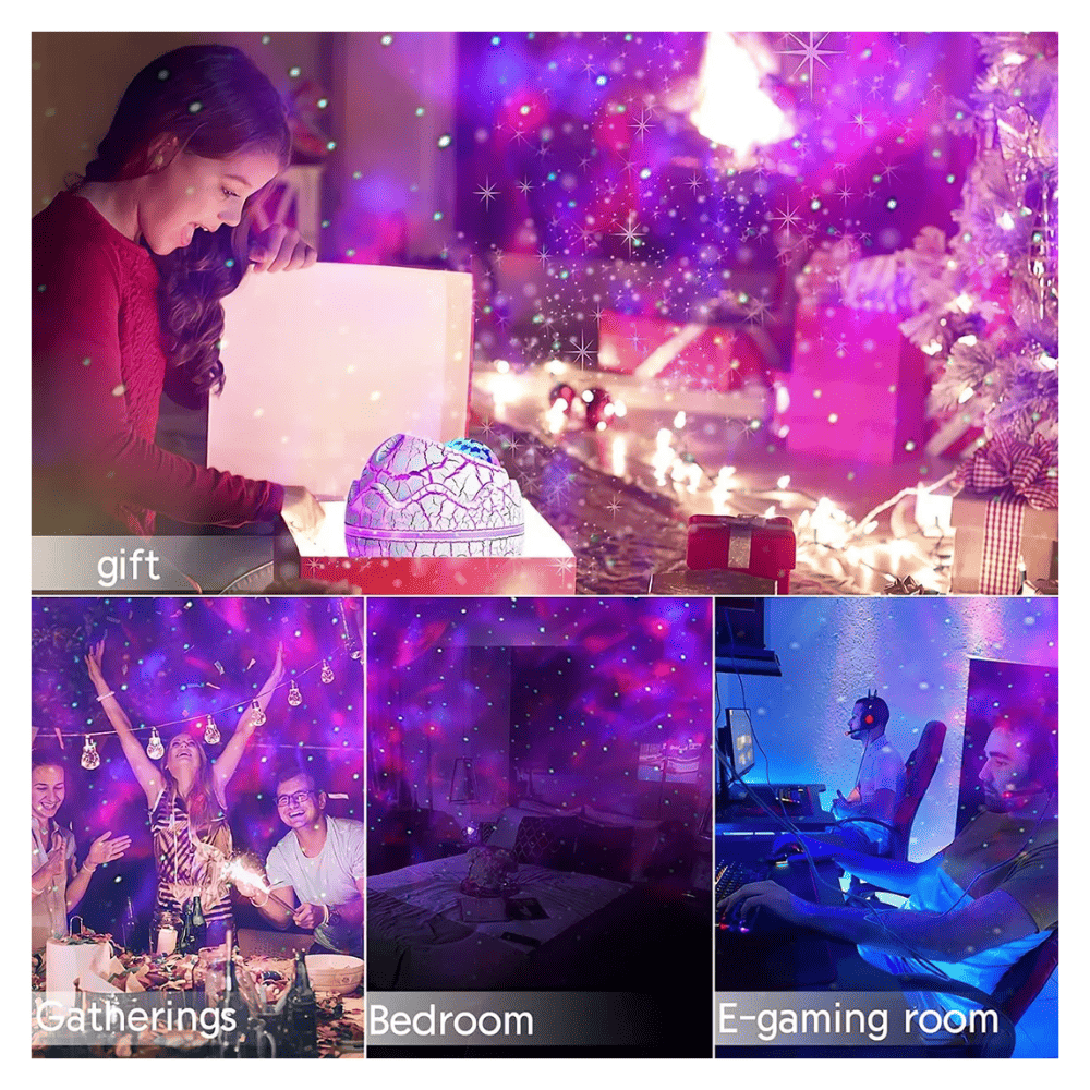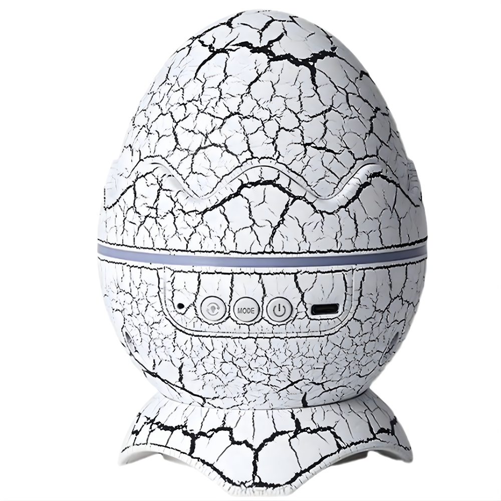 Este proyector con diseño en formato de huevo crea una atmósfera envolvente mediante patrones luminosos que transforman cualquier espacio en un entorno relajante. Su estructura permite difundir efectos visuales amplios que cubren paredes y techos, generando una experiencia inmersiva ideal para descanso, meditación o ambientación nocturna.